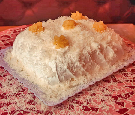 Massa branca com recheio de creme de leite condensado com coco e abacaxi cozido, cobertura de marshmallow com coco e abacaxi.