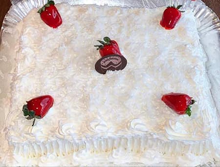 Massa branca recheio de creme de leite moça com morangos e outro de cocada. Cobertura de chantilly ou marchmelow morango e coco.