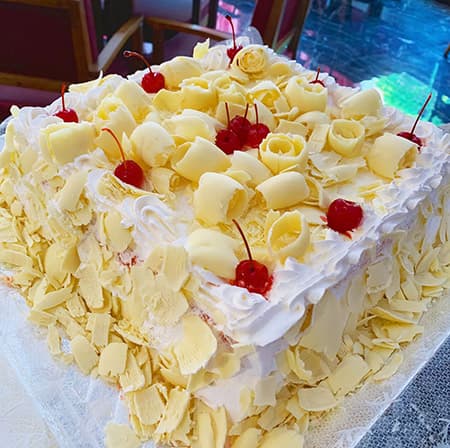 Massa branca com recheio de creme de leite condensado, chantilly e cerejas. Cobertura de chantilly e raspas de chocolate branco.