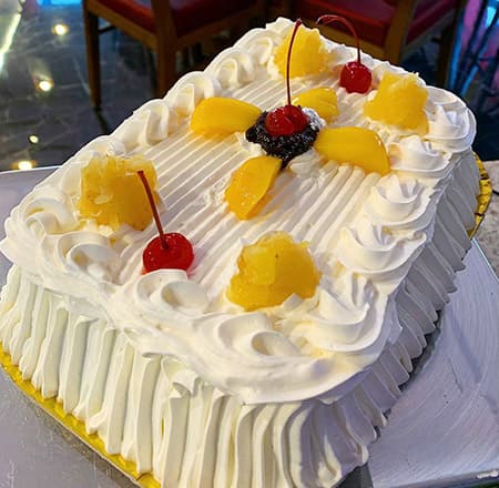Massa branca com recheio de creme de leite condensado e frutas, abacaxi, pêssego, ameixa e cerejas. Cobertura de chantilly ou marshmallow e frutas.